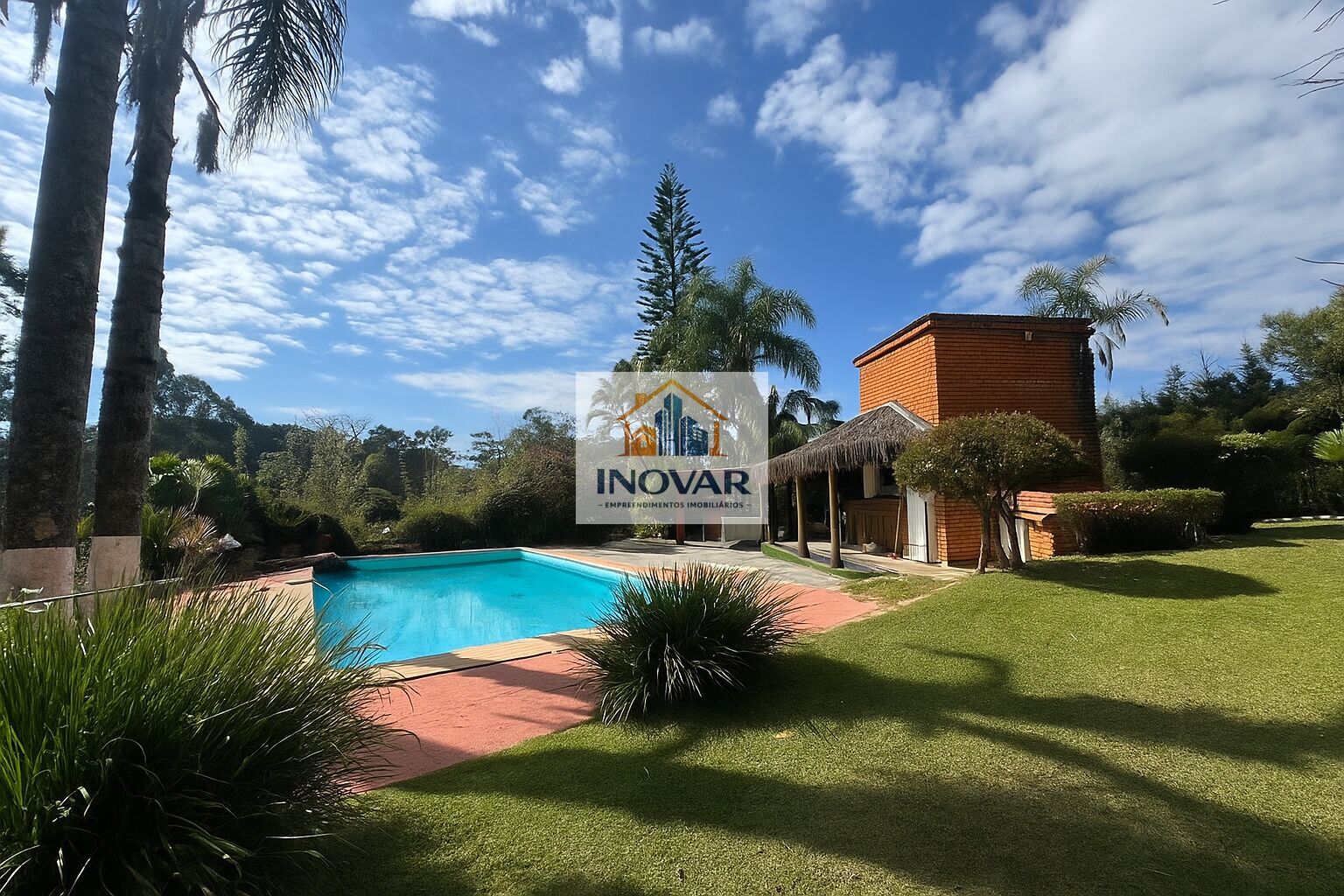 • Quiosque de sapê com área gourmet, churrasqueira, cômodo de despejo e 1 banheiro