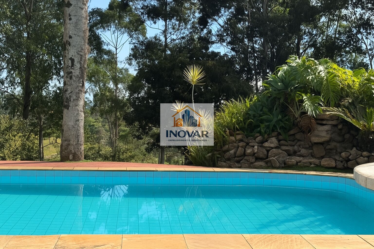 • Piscina azulejada (11 x 6 m | profundidade de 1,20 a 1,80 m) com cascata em pedras
